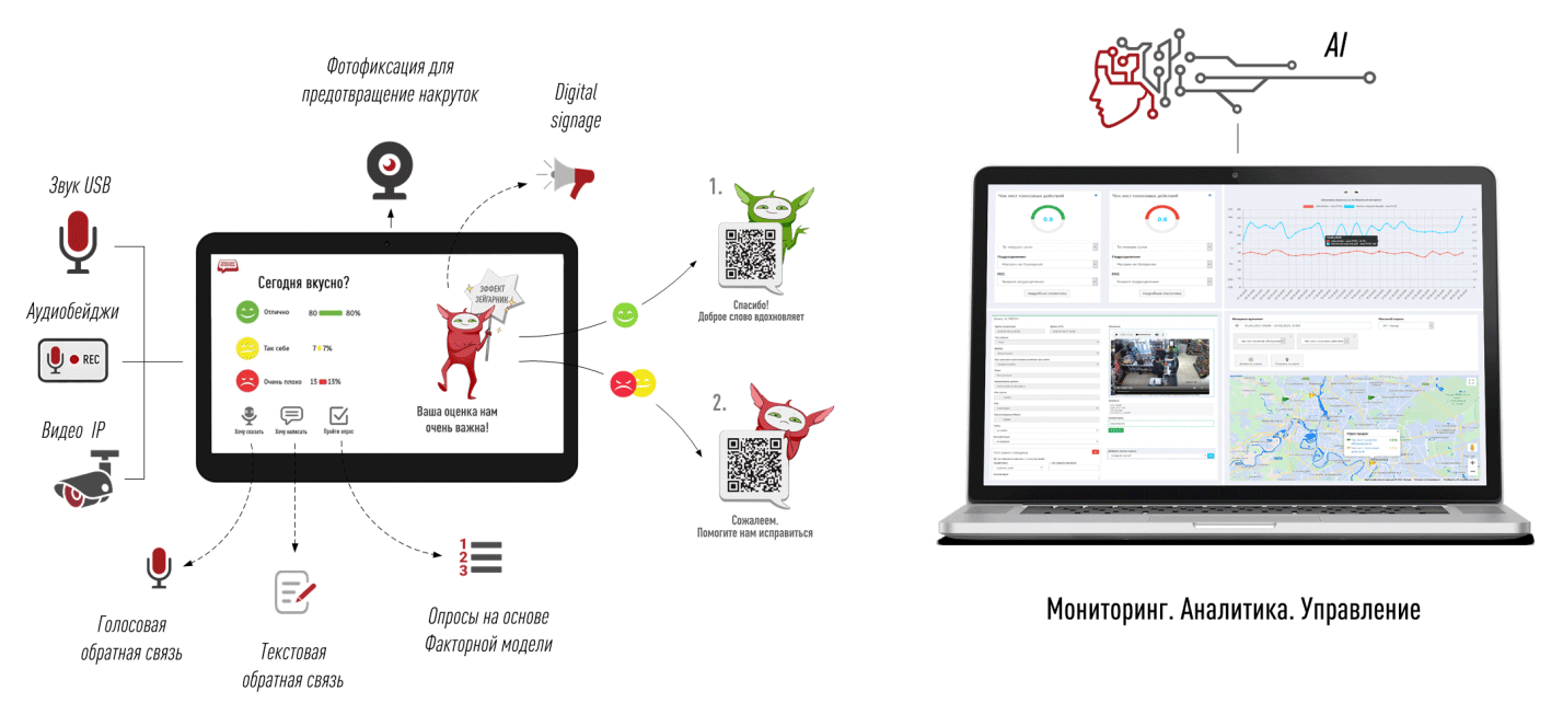 Терминал принимает эмоциональные оценки, голосовые и текстовые отзывы, а также позволяет проводить репрезентативные опросы с управляемой выборкой. В старшей модели добавляется видеоаналитика эмоционального фона клиентов и сотрудников.
