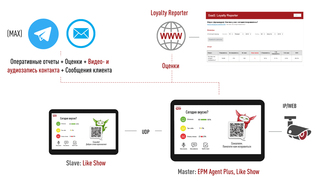 При выборе определённой оценки автоматически запускается запись контакта с клиентом - с помощью любой IP- или WEB-камеры. Запись отправляется в Telegram (MAX) и на электронную почту, что позволяет связать оценку с конкретным человеком и ситуацией.