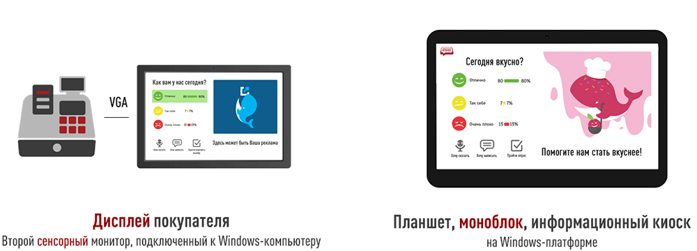 Уникальное преимущество - поддержка POS-терминалов со вторым сенсорным монитором. Это идеальное решение для точек продаж: касса продолжает работать в обычном режиме, а на втором экране собирается обратная связь.