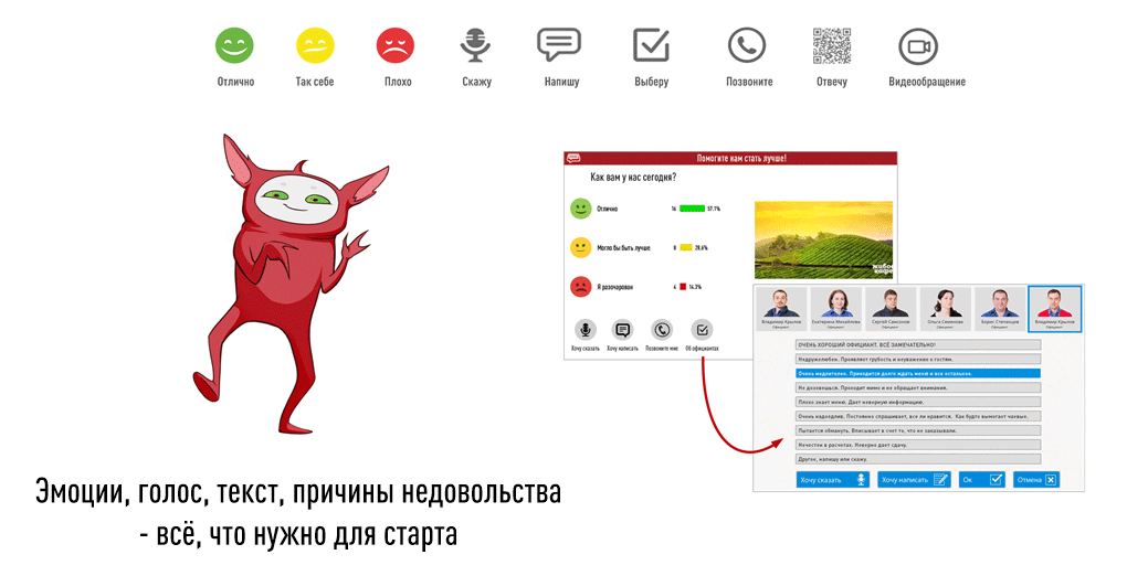 Терминал принимает эмоциональные оценки, голосовые и текстовые отзывы, а также позволяет проводить репрезентативные опросы с управляемой выборкой. В старшей модели добавляется видеоаналитика эмоционального фона клиентов и сотрудников.