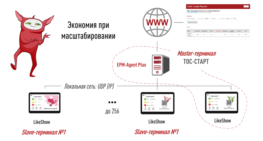 В офисах с несколькими точками контакта не нужно ставить полноценный терминал на каждое окно. Один Master-терминал управляет несколькими Slave-терминалами, которые передают данные на центральный узел. Аналитика и управление - единые, затраты - кратно ниже.