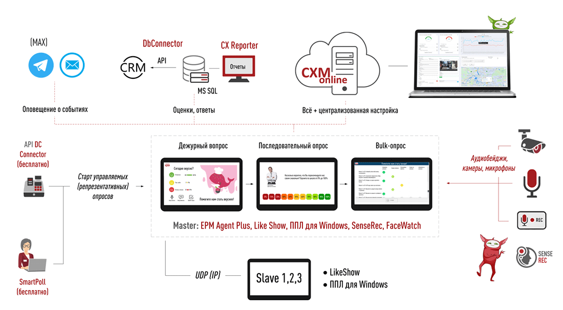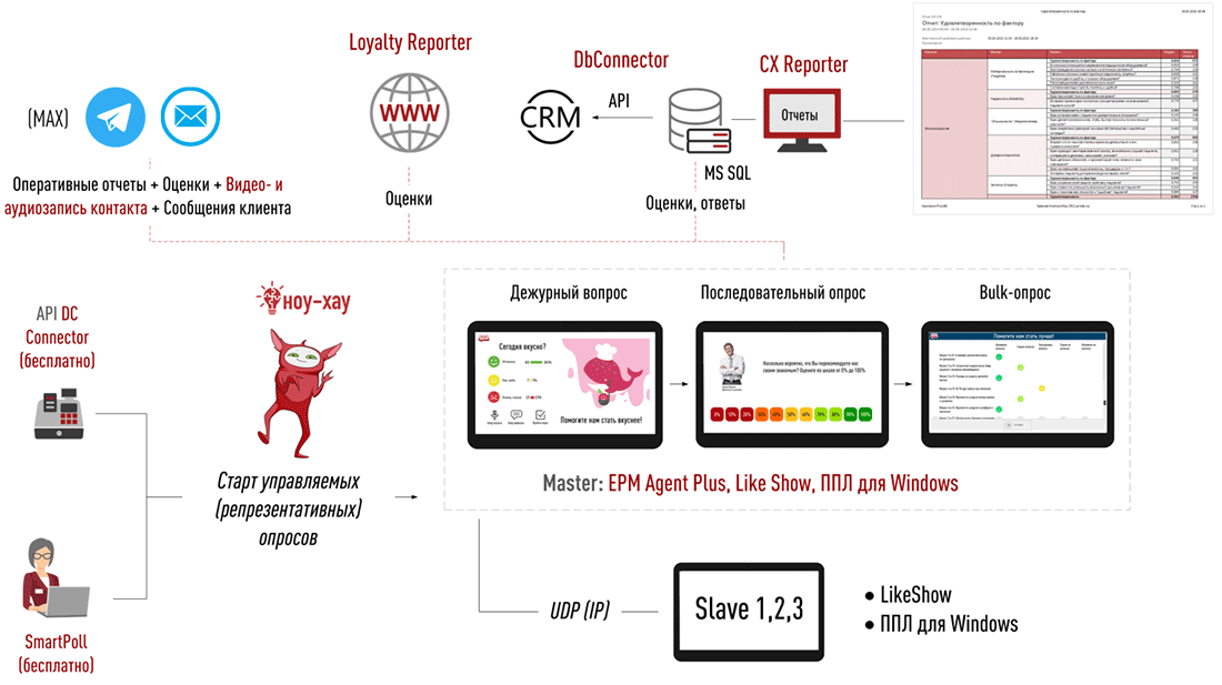 Для интеграции с CRM предназначен API API: DbConnector. Он передаёт данные о клиентском опыте и работе персонала напрямую в вашу систему, что даёт возможность увязывать обратную связь с другими метриками и историей взаимодействия с клиентом.