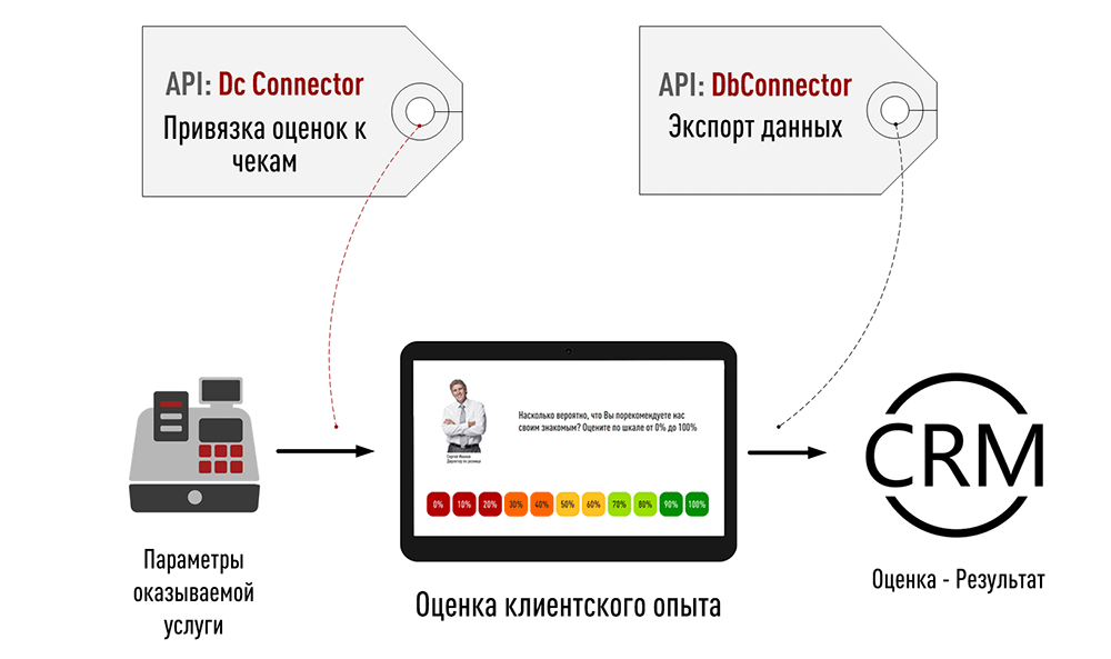 Для связи с приложением передней линии (например, кассой) используется API API: DC Connector. Это позволяет анализировать клиентский опыт в различных разрезах: в зависимости от оказанной услуги, размера чека, категории клиента и других параметров.