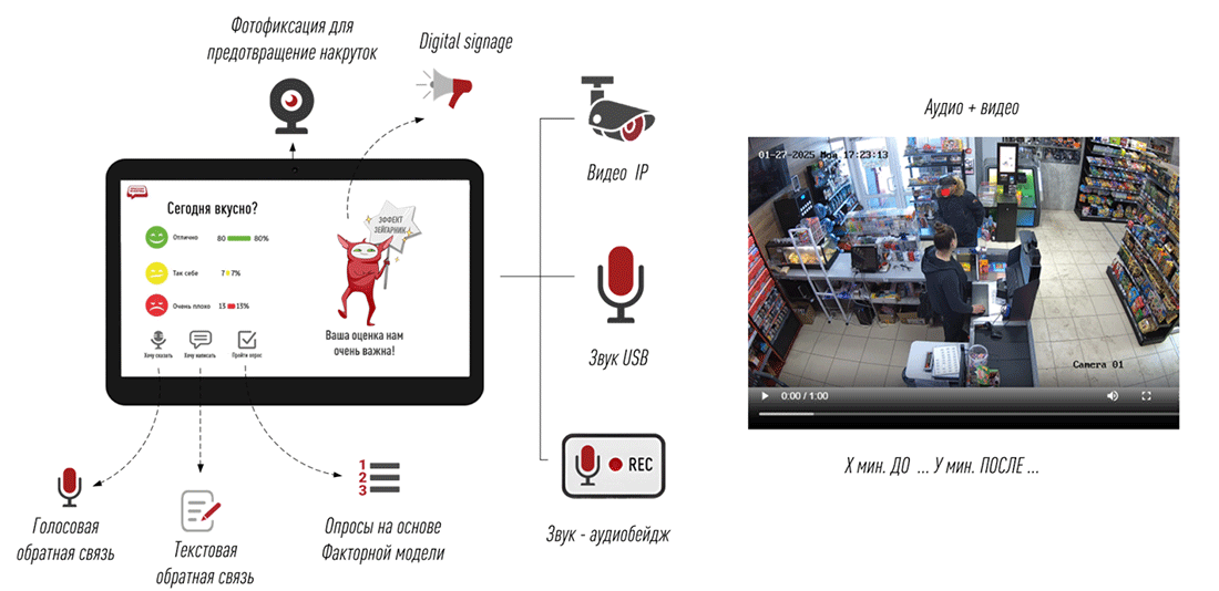 Это не только даёт контекст для разбора недовольства, но и служит эффективным инструментом предотвращения накруток со стороны заинтересованного персонала. Для записи может использоваться внешняя камера, уже установленная в помещении.